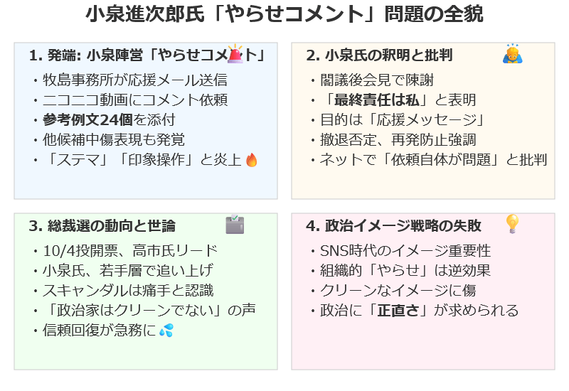 政治家のイメージ戦略は、SNSや動画配信の時代にますます重要になっていますが、今回の「やらせコメント」騒動は、支持を操作しようとする試みが裏目に出るリスクを示しています。24個もの例文を用意する組織的な動きは、逆に「本物の支持じゃない」と見られ、若者に人気だった小泉氏のクリーンなイメージに傷がついたかもしれません。