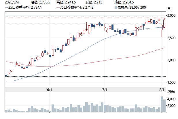 主な原因は、中国市場の需要減少、顧客の在庫調整、そして円高による影響です。決算発表直後、PTS(夜間取引)で株価は一時8.4%下落。しかし、その後株価は反発し、8月4日時点で2,822円(+1.31%)を記録し、高値更新の動きを見せました。この急回復の理由は何でしょうか?