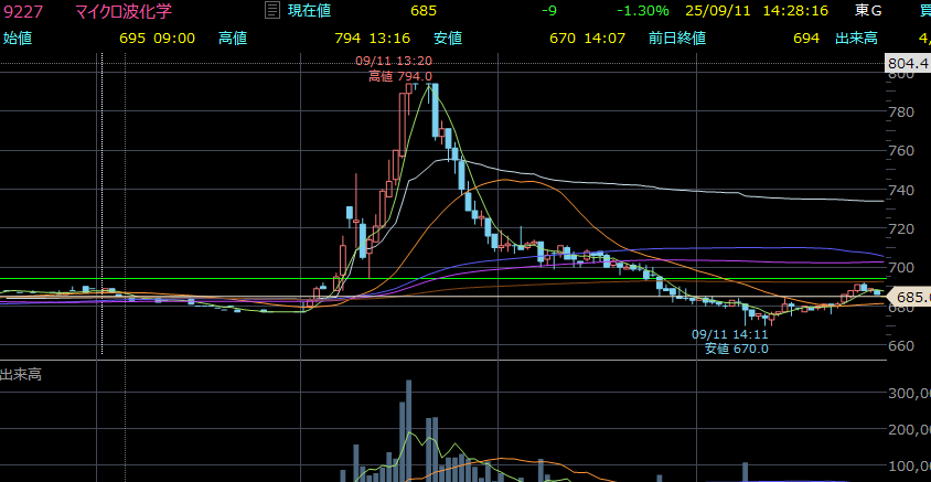 9月11日 マイクロ波化学(株)【9227】1分足チャート