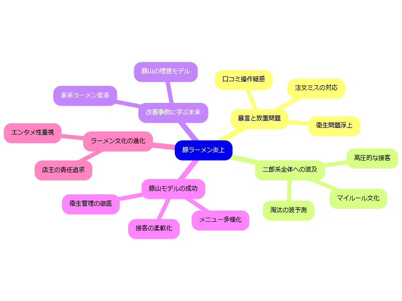 豚ラーメン炎上は、店主のミスと放置が最大の悪。ですが、二郎系全体の「マイルール至上主義」が根源にあり、SNSの拡散力で波及します。一方、豚山や家系の事例から、味の伝統を守りつつ接客を人間味あるものに変える道筋が見えます。5年以内に二郎系半減の予測もありますが、謝罪動画や研修導入で挽回可能。ラーメンはエンタメ文化として進化すべきです。