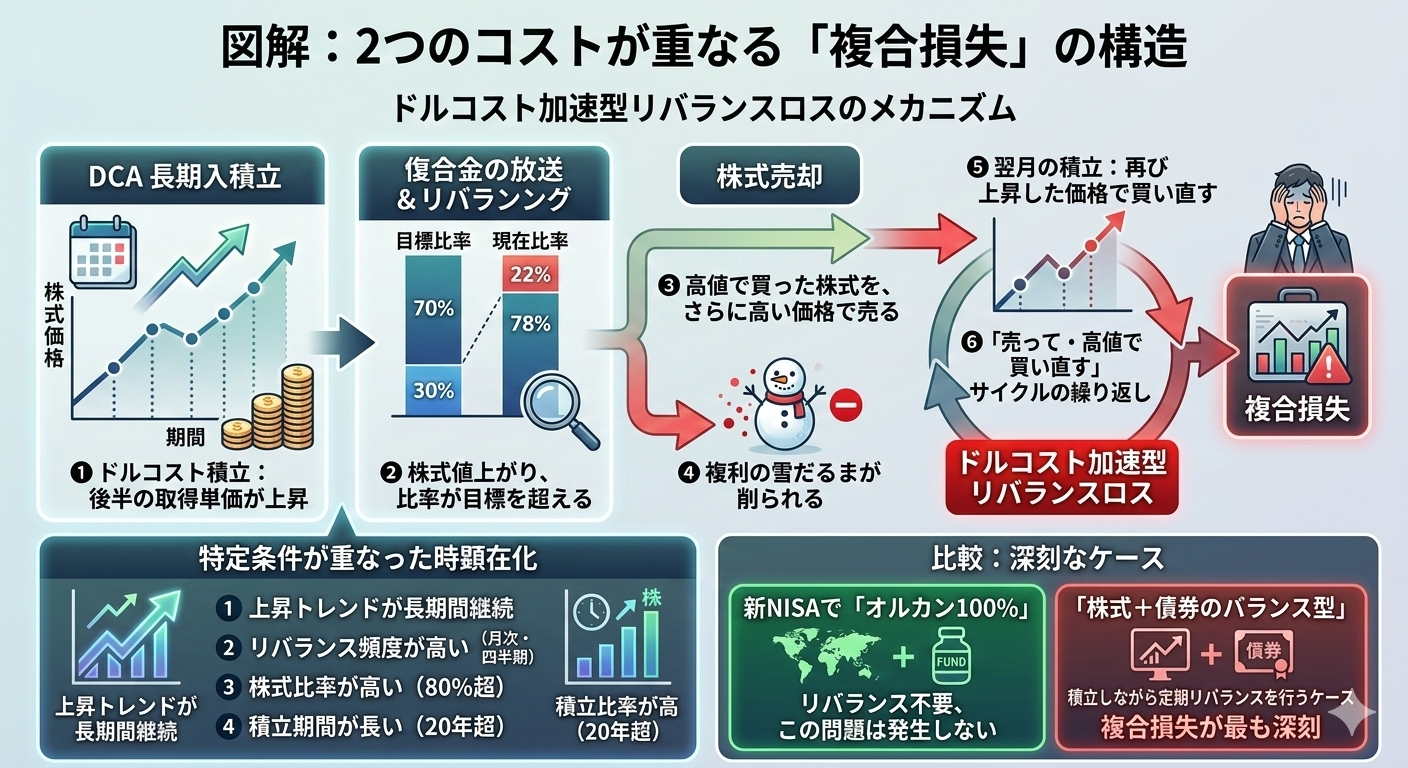 ドルコスト平均法もリバランスも、それ単体では合理的な戦略だ。だが2つを組み合わせると、上昇相場の長期局面において「高値で買い続けながら、上昇した資産を売る」という構造が繰り返される。