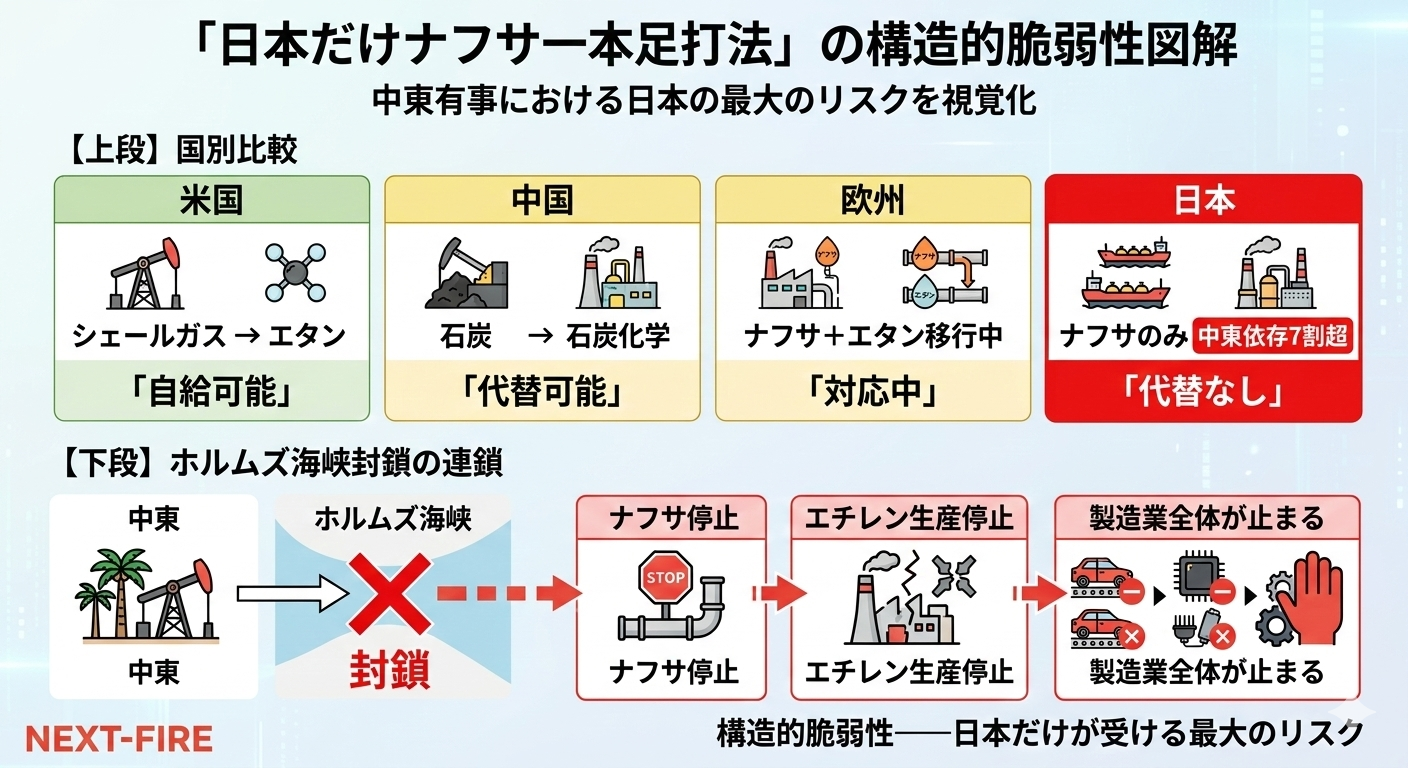日本だけが、代替原料を持たないナフサ一本足打法のまま、中東依存度7割超の状態に置かれている。