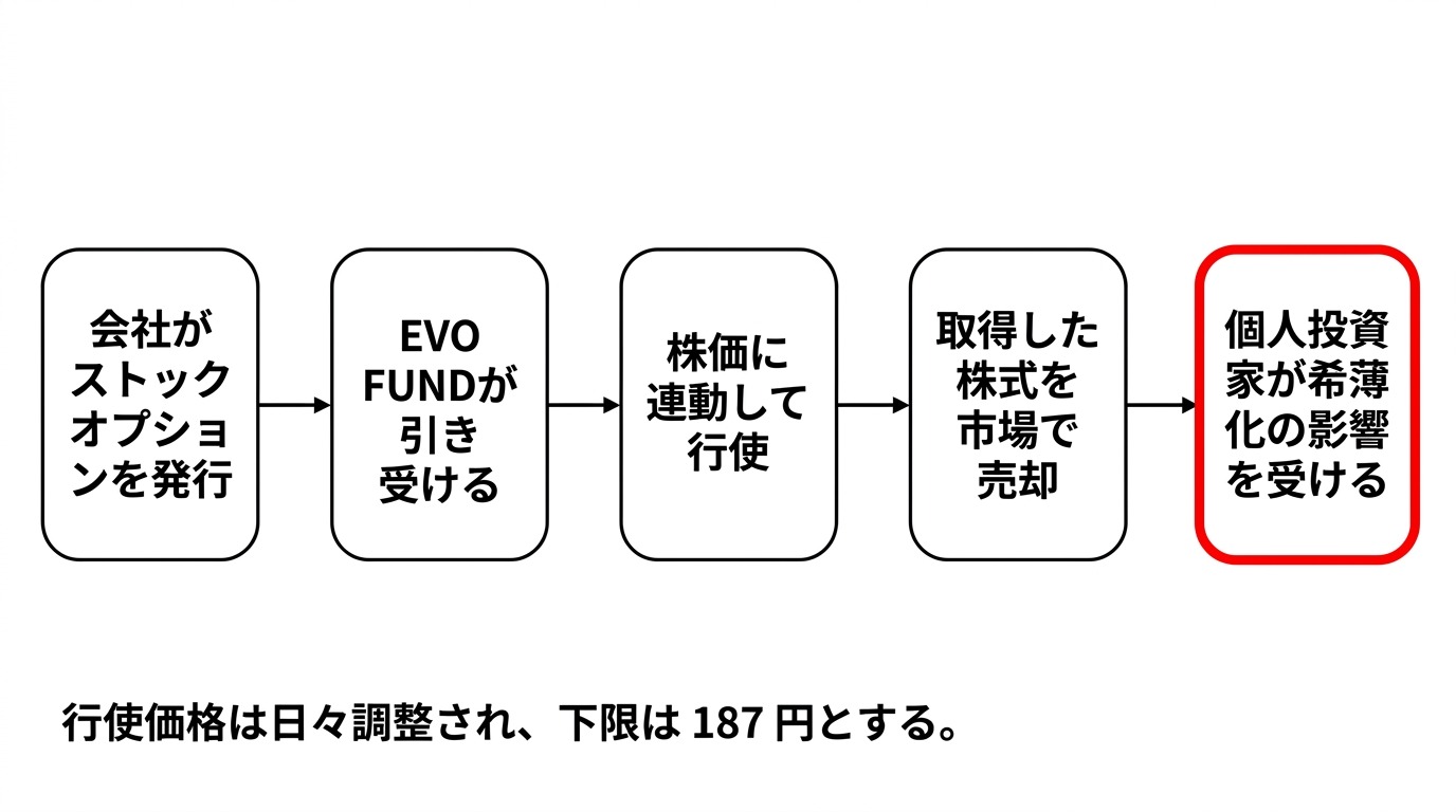 つまり、株価が下がる → 行使価額も下がる → EVO FUNDはその株価で株を取得できる → 市場で売却する