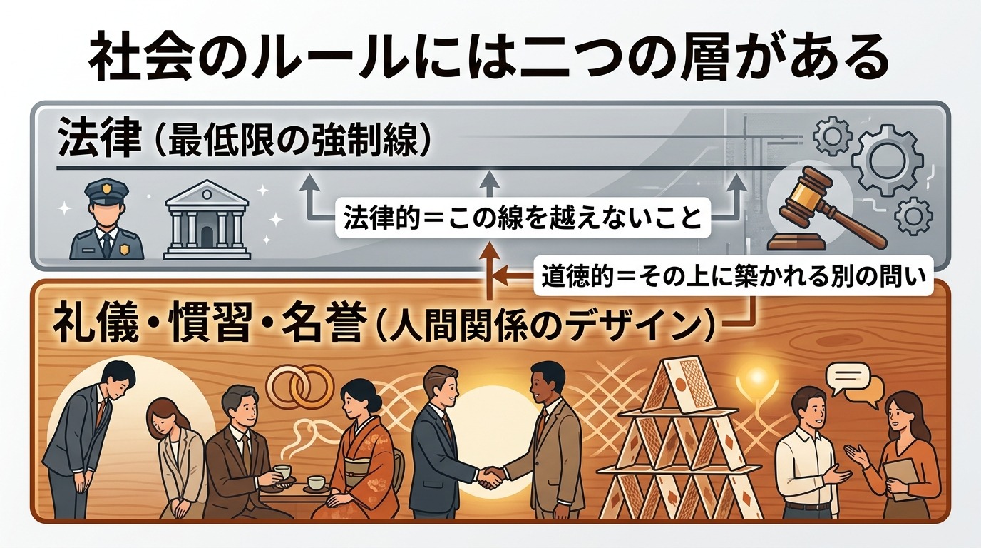 社会のルールには二層ある。法律という「最低限の強制ライン」と、慣行・礼節・仁義という「その上に乗る人間関係の設計」だ。後者を「非効率」「感情論」と切り捨てる人間が増えた社会は、法律だけでは守れない何かを確実に失っていく。
