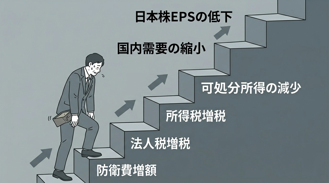 現時点で確定している増税だけでも、2027年から所得税に1%の上乗せ、2026年4月から法人税に4%の上乗せが予定されている。法人税増税は企業の純利益を直接圧迫する——つまりEPSが下がり、PERが変わらなければ株価は下がる。